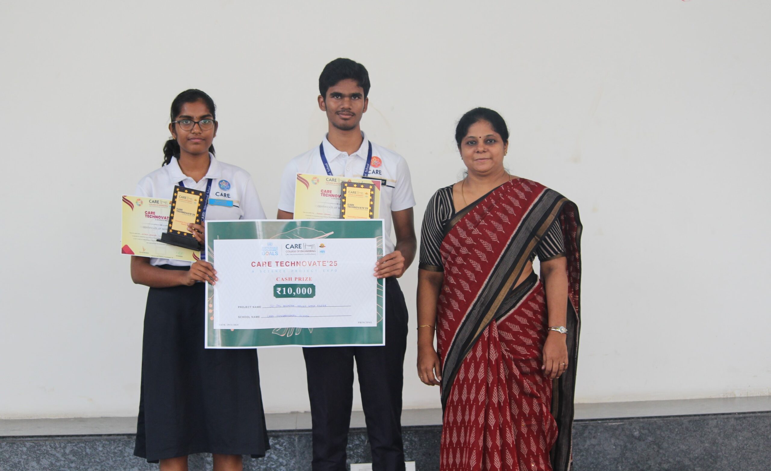 Nithila Jenifer (X) & Benny Joyson (XI) wowed everyone with Su-Jal, a biomimetic disaster-relief water filtration system, at CARE Technovate ’25 — a science project expo held on 3rd Dec at CARE College of Engineering.